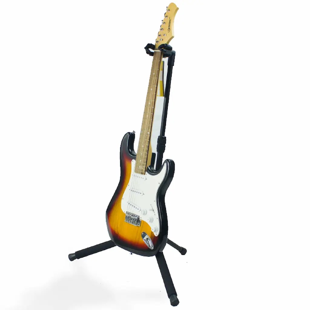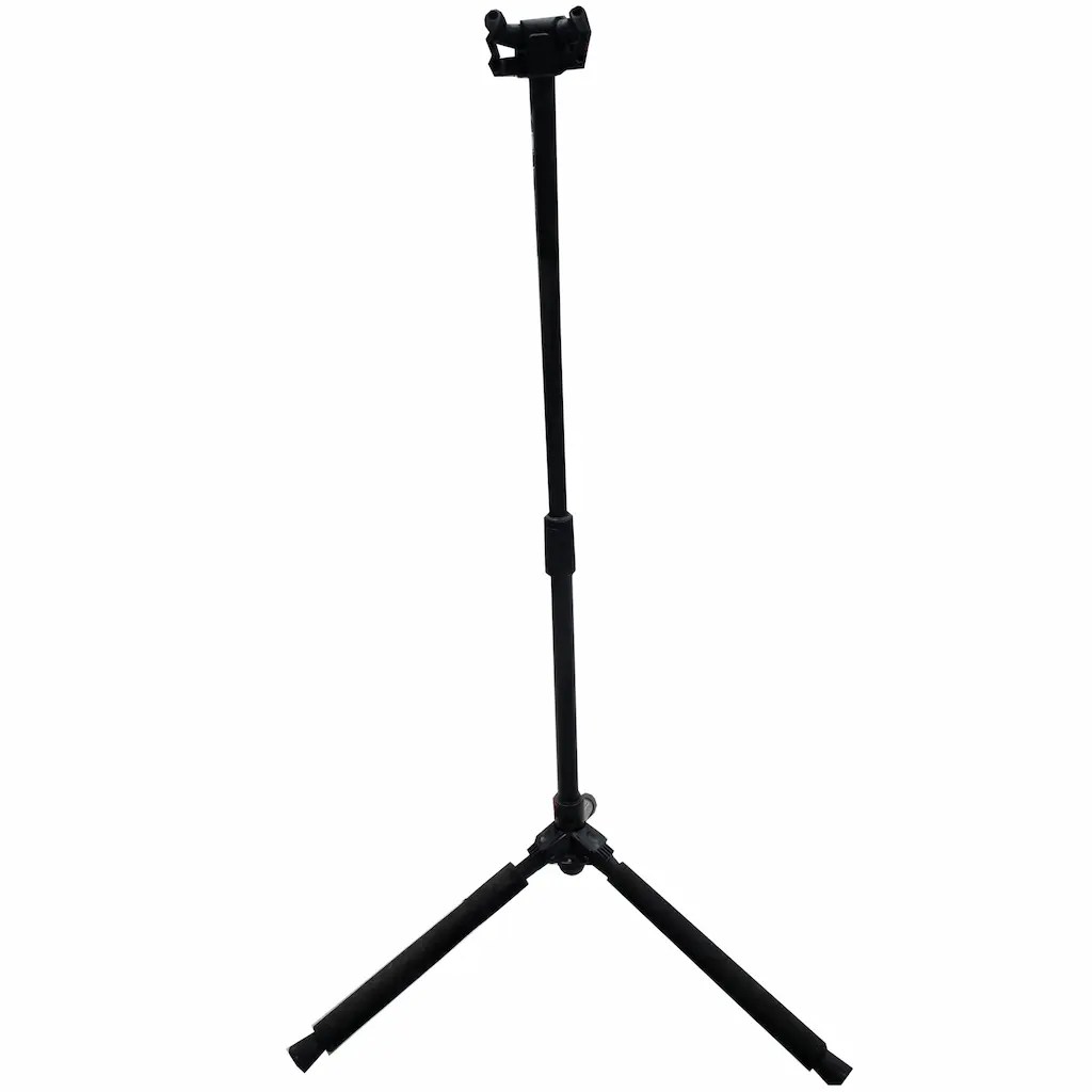 Professional DJ equipment stand providing compact workspace for mixing console and controller mounting. Sturdy construction enables reliable equipment support.